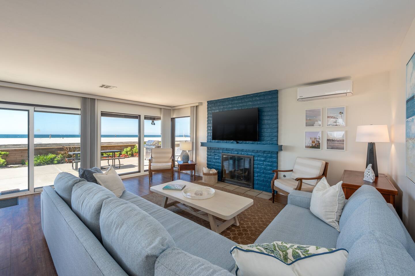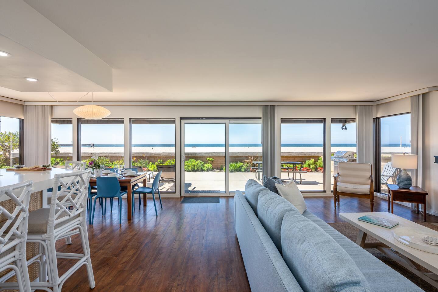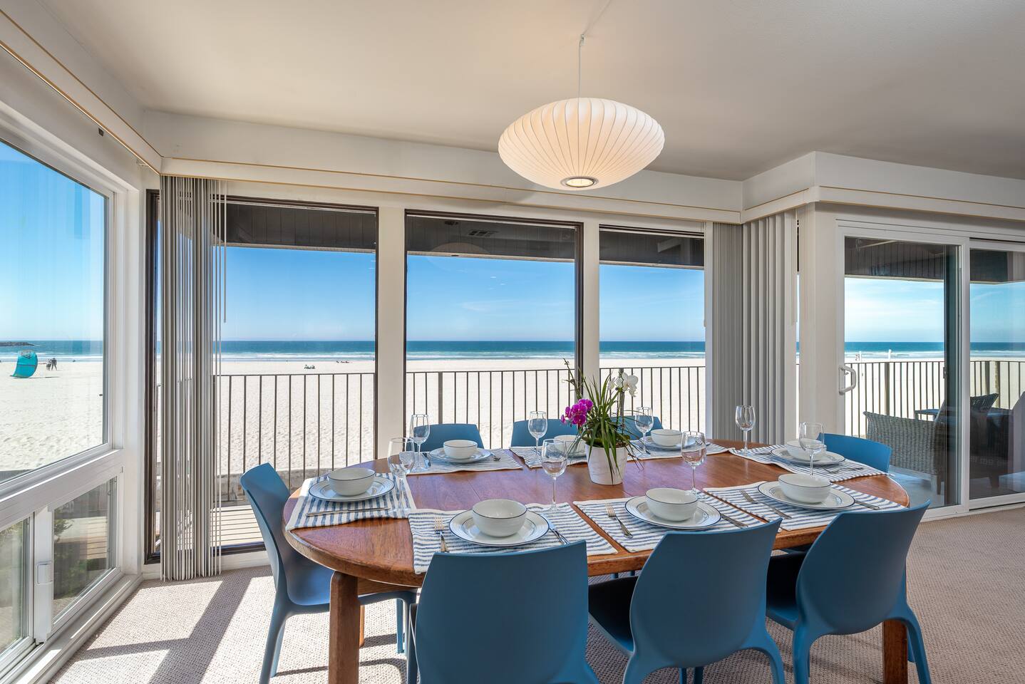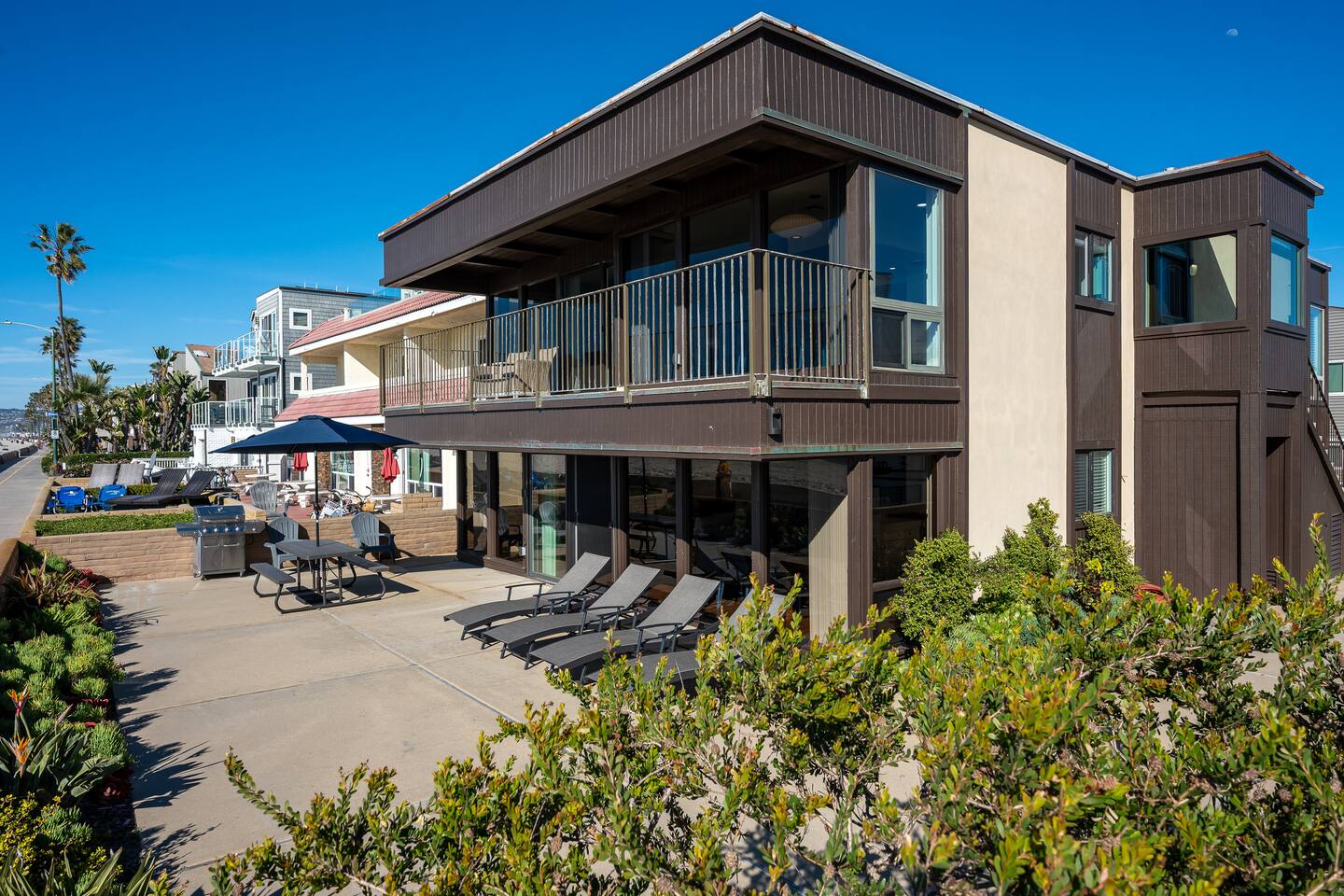 Classic coastal character meets modern comfort with air conditioning in both homes. The ground floor residence opens directly to a large beachfront patio just steps from the sand, while the second floor home offers elevated privacy and sweeping ocean views from its balcony. Together, the two homes provide an ideal setup for large families, multi family vacations, or group retreats who want to stay together while still enjoying separate living spaces. The two residences are located on separate floors of the same oceanfront duplex and do not connect internally. Walk to the Mission Beach Jetty, cross the strand to Mission Bay, or explore Pacific Beach dining just minutes away. Designed for relaxed gatherings and memorable beachfront stays. TOP HIGHLIGHTS * Entire oceanfront duplex on the Mission Beach Boardwalk * Two separate 3 bedroom beachfront residences * Air conditioning in both homes which is rare for beachfront properties * Expansive beachfront patio plus private ocean view balcony * 6 dedicated off street parking spaces * Ideal setup for large families or group trips BEDROOMS | Sleeps 12 Each residence features the same layout. Ground Floor Residence * Primary Suite: King bed, private ensuite bath, 44 inch Samsung TV with Apple TV * Bedroom 2: King bed * Bedroom 3: Two twin beds Second Floor Residence * Primary Suite: King bed, private ensuite bath, 44 inch Samsung TV with Apple TV * Bedroom 2: King bed * Bedroom 3: Two twin beds BATHROOMS | 4 Full Each residence includes two bathrooms. Per Residence * Primary ensuite with tub and shower combo * Hall bathroom with walk in shower * Fresh towels and essentials provided KITCHENS AND DINING Both homes feature fully equipped kitchens with cookware, dishware, and small appliances including coffee makers. Each residence includes its own dining space for shared meals after beach days. LIVING AREAS Each residence includes a separate living room designed for comfort and ocean views. * 65 inch Samsung Smart TV with Apple TV * Comfortable seating with direct ocean views Ground Floor Residence Seamless indoor outdoor flow to the beachfront patio. Second Floor Residence Elevated vantage point above the boardwalk with expansive ocean views. OUTDOOR SPACES Guests enjoy multiple outdoor areas directly on the oceanfront boardwalk. Ground Floor * Large beachfront patio just steps from the sand * Ideal for outdoor dining and relaxing Second Floor * Private balcony with comfortable seating and ocean views Shared * Beachfront BBQ grill * Direct access to the boardwalk and beach COMFORT AND CONVENIENCE * Air conditioning in both homes * Two in home washers and dryers * High speed Wi Fi * 6 dedicated parking spaces located directly behind the property Parking is extremely rare in Mission Beach, making this property especially convenient for larger groups. LOCATION | South Mission Beach Located on the quieter south end of Mission Beach, this home sits directly on the boardwalk while being slightly removed from the busiest stretch near Belmont Park. * 10 minute walk to Belmont Park and beachfront dining * 5 minute walk to the Mission Beach Jetty * Easy access to Mission Bay beaches and bike paths * 10 minutes to SeaWorld * 20 minutes to the San Diego Zoo * 45 minutes to LEGOLAND California