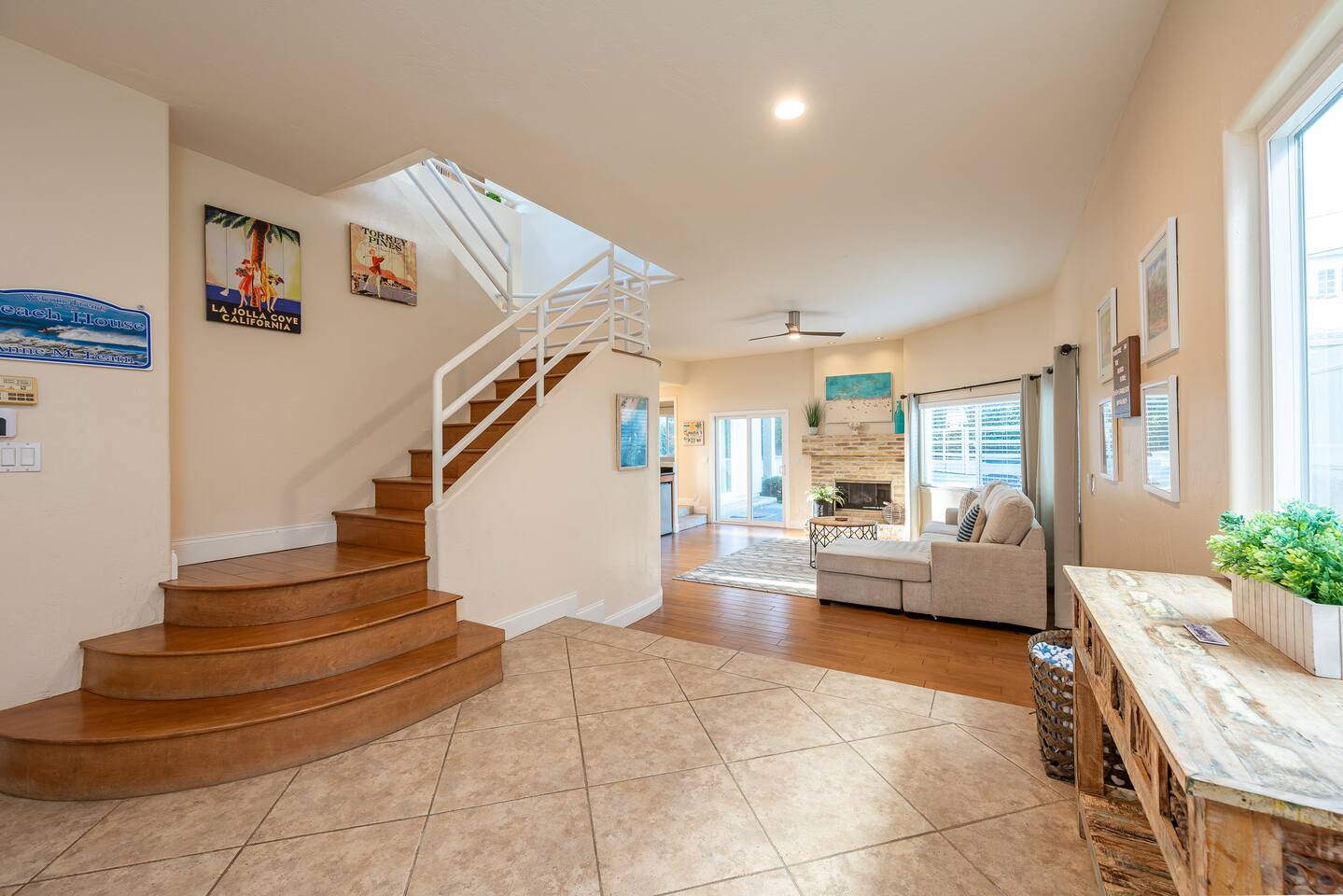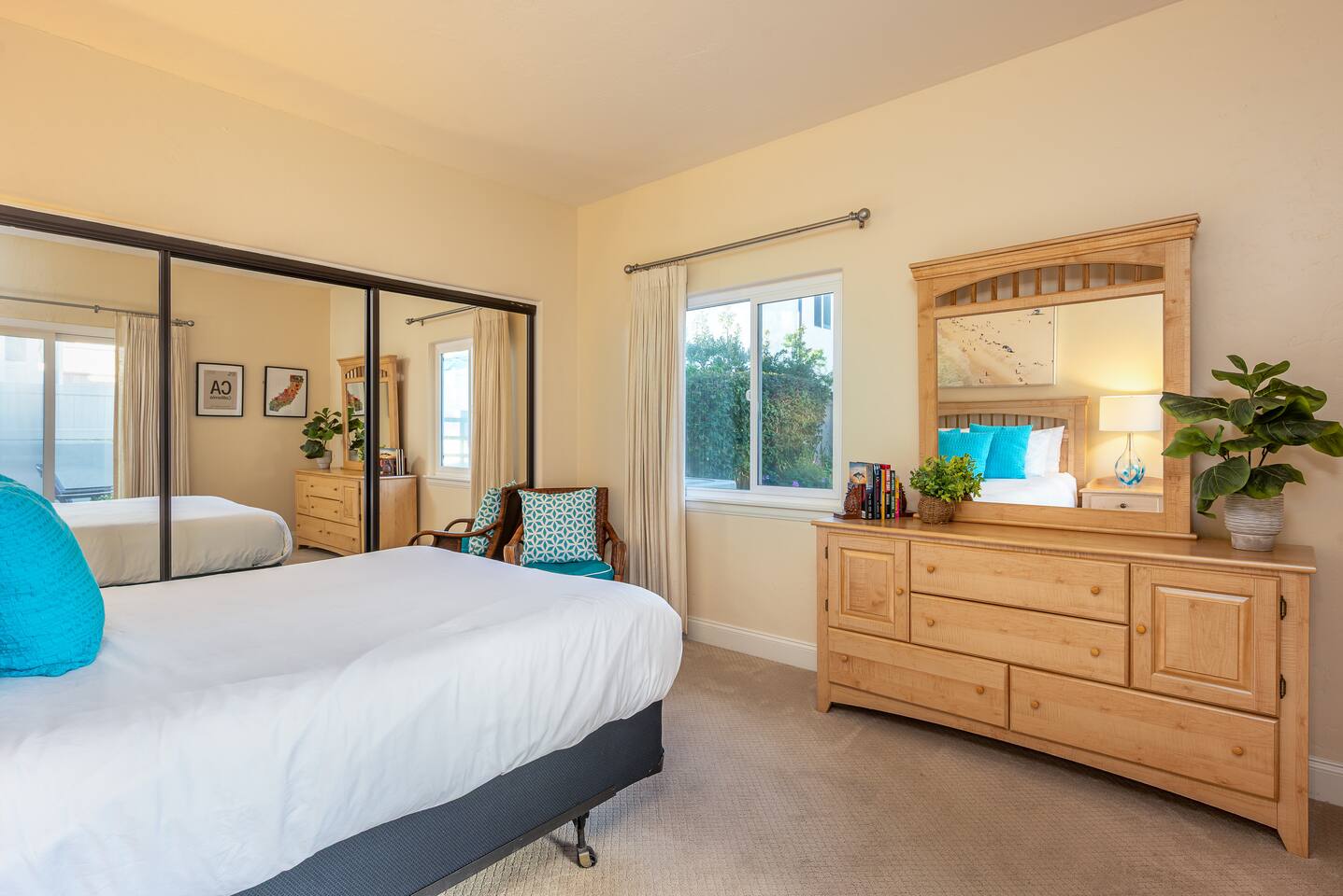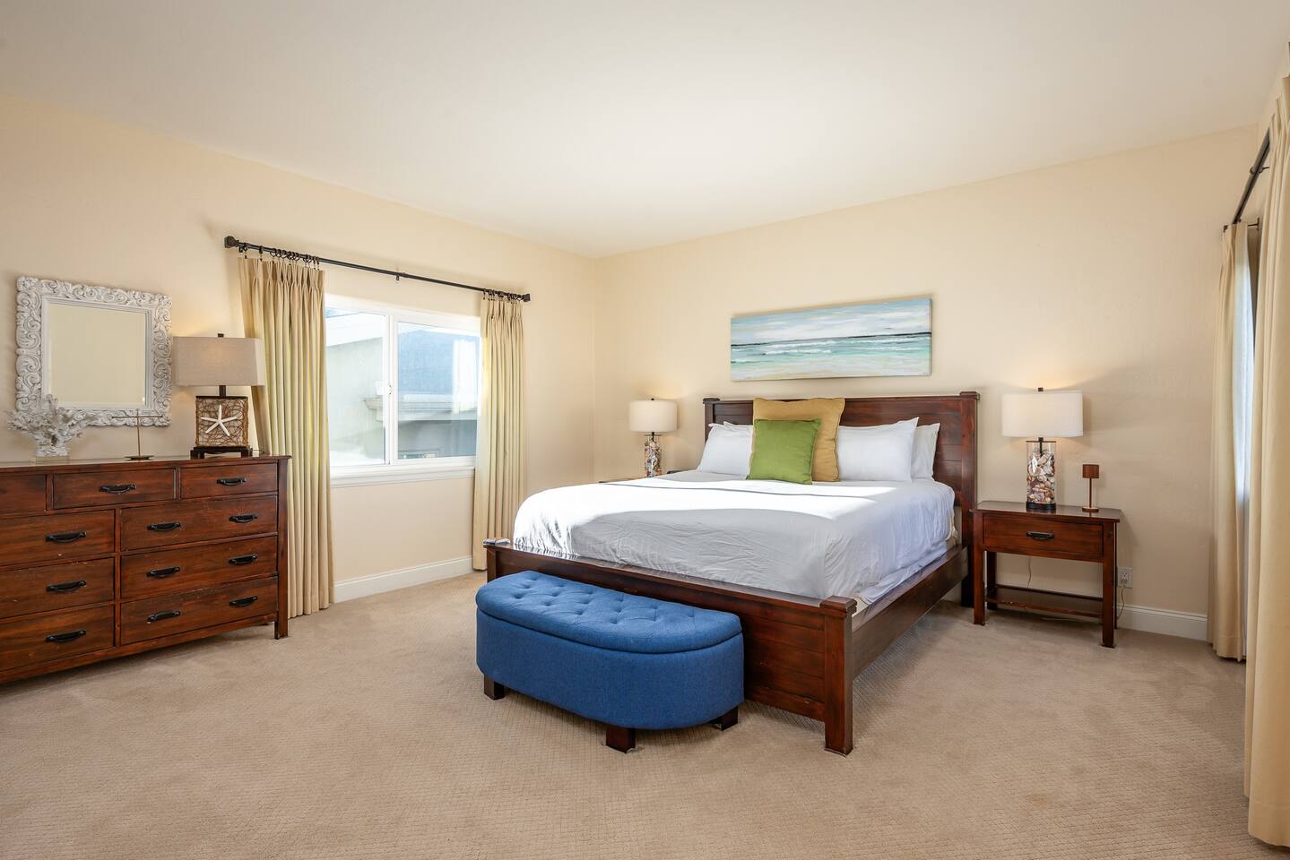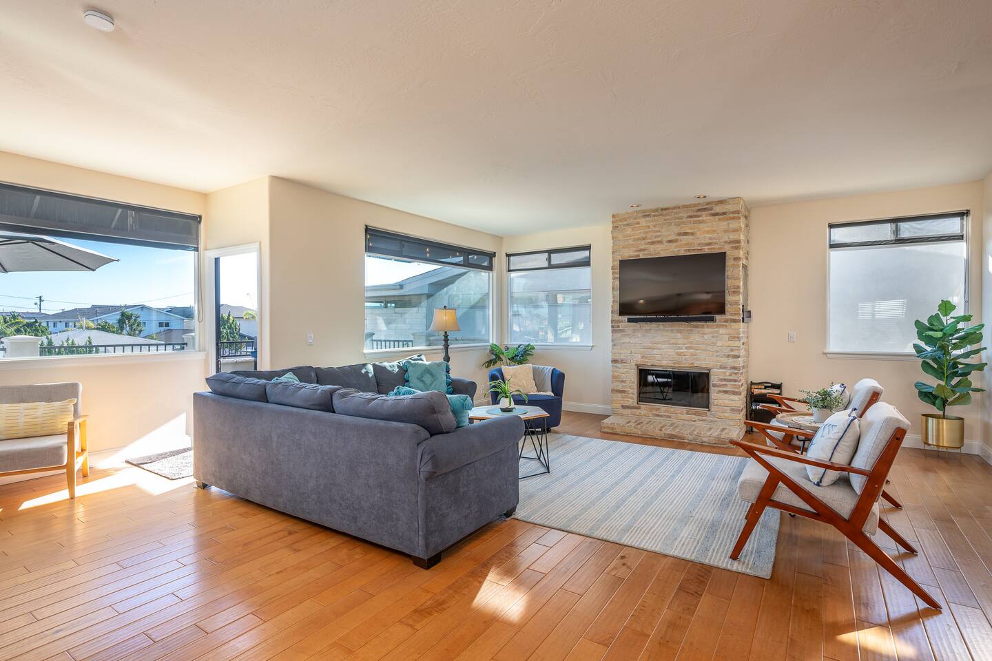 KEY FEATURES: ☀️ Prime Location – Just steps from the beach, perfect for enjoying sun, surf, and ocean breezes ☀️ Sleeps 8 | 4 Bedrooms: Master Bedroom with king bed, ensuite spa-style bathroom; Bedroom 2 king bed with private patio; Bedroom 3 queen bed; Bedroom 4 two twin beds ☀️ 3 Full Bathrooms – Master ensuite: double sinks, jacuzzi spa tub, walk-in shower; hallway full bathroom: tub/shower combo; main-floor full bathroom: tub/shower combo ☀️ Fully Equipped Kitchen – Full kitchen with bar seating for 3, coffee maker (coffee, creamer, sugar provided), blender, air fryer, toaster, stove, microwave, refrigerator, oven, dishwasher, and all cooking essentials ☀️ Dining Areas – Second-floor dining table seats 8 ☀️ Multiple Living Spaces – Second-floor living room with L-shaped sofa, fireplace, and Smart TV with soundbar; First-floor living room with large sofa, fireplace, mini-fridge, flat-screen Smart TV, and board games for added entertainment ☀️ Central A/C & Heating — for year-round comfort ☀️ Washer & Dryer — In-unit laundry for your convenience ☀️ Family Friendly – Beach towels, toys, wagon, boogie boards, chairs, and drying rack provided ☀️ Backyard Patio – Features a jacuzzi tub, chairs for relaxing and unwinding ☀️ Upstairs Deck– Equipped with a grill, large L-shaped sofa, dining table for 6, and umbrella for shaded outdoor dining ☀️ Parking – 4 driveway spaces + additional street parking ✨ BEDROOMS ✨ This two-level home comfortably sleeps up to 8 guests in 4 thoughtfully designed bedrooms: Master Bedroom (Upstairs) features a king-size bed, dresser, large closet, standing fan, and an ensuite bathroom with double sinks, a jacuzzi spa tub, and a walk-in shower, Bedroom 2 features a king-size bed, a small patio, a cabinet, and a desk with a chair ideal for remote work or leisure, Bedroom 3 (First Floor) features a queen bed and a closet, Bedroom 4 features two twin beds and a closet ✨ BATHROOMS ✨ There are three full bathrooms throughout the home. The ensuite bathroom features a jacuzzi tub and standing shower, Bathroom 2 includes a shower/tub combo, and Bathroom 3 on the first floor also has a shower/tub combo, easily accessible from the living areas. Fresh towels and complimentary toiletries are provided for your convenience. ✨ KITCHEN & LIVING AREA ✨ Enjoy a fully equipped kitchen with bar seating for 3, stocked with all your cooking essentials, including a coffee maker (with coffee, creamer, and sugar provided), blender, toaster, dishwasher, and more. You’ll enjoy two separate living areas: The Living Room (First Floor) features a large sofa, fireplace, mini fridge, a flat-screen Smart TV, and a variety of board games for added entertainment, while the Living Room (Second Floor) features a large L-shaped sofa, Smart TV with soundbar, fireplace, and standing fan. ✨ OUTSIDE SPACE ✨ Wake up to breathtaking sunrises and enjoy your morning coffee from the Upstairs Deck, which features a grill, large L-shaped sofa, dining table for 6, and an umbrella for shaded outdoor dining, or relax in the Backyard Patio, which includes a jacuzzi tub, chairs for unwinding and hanging out.