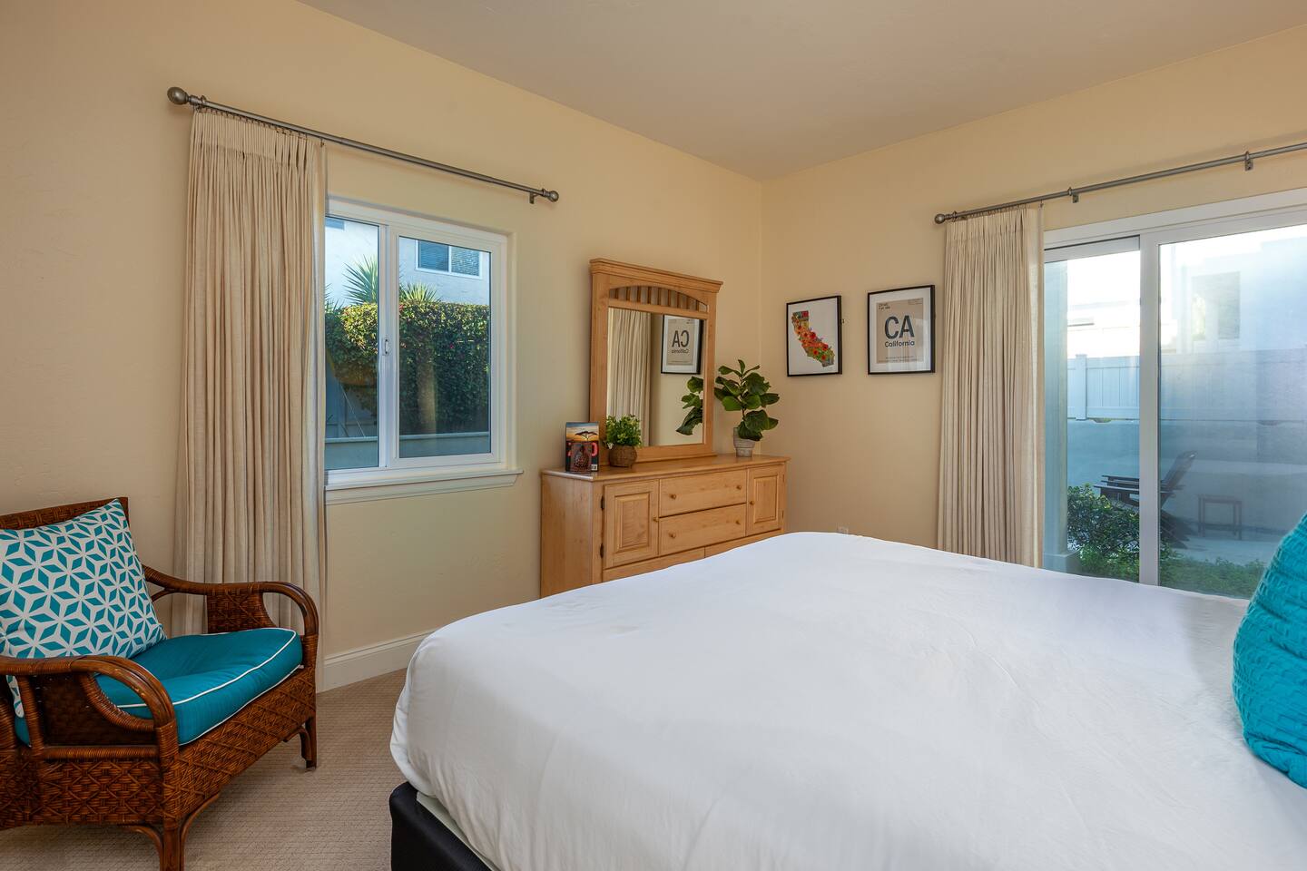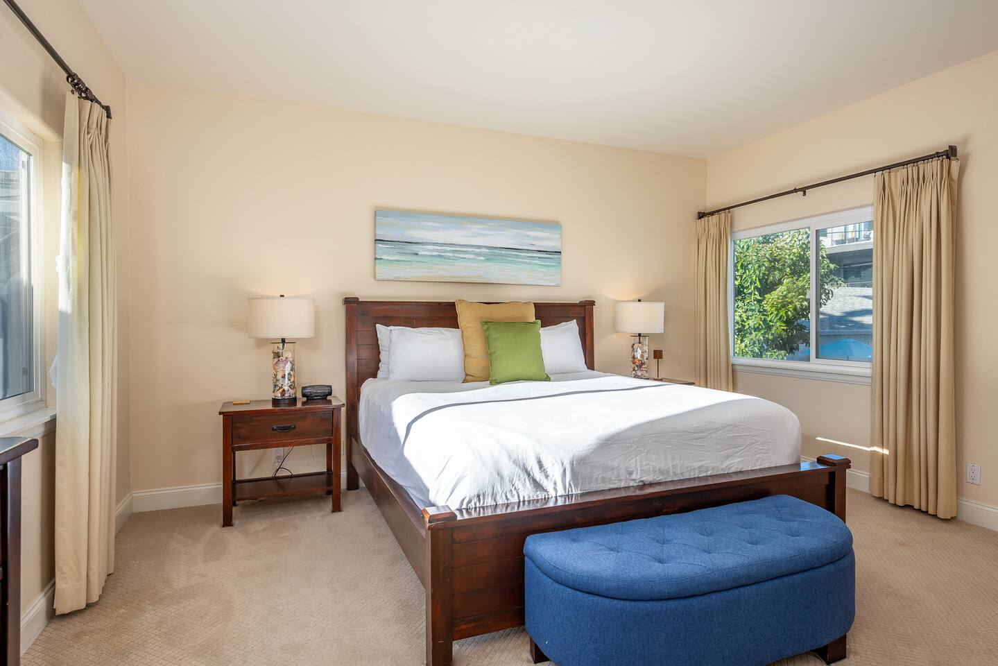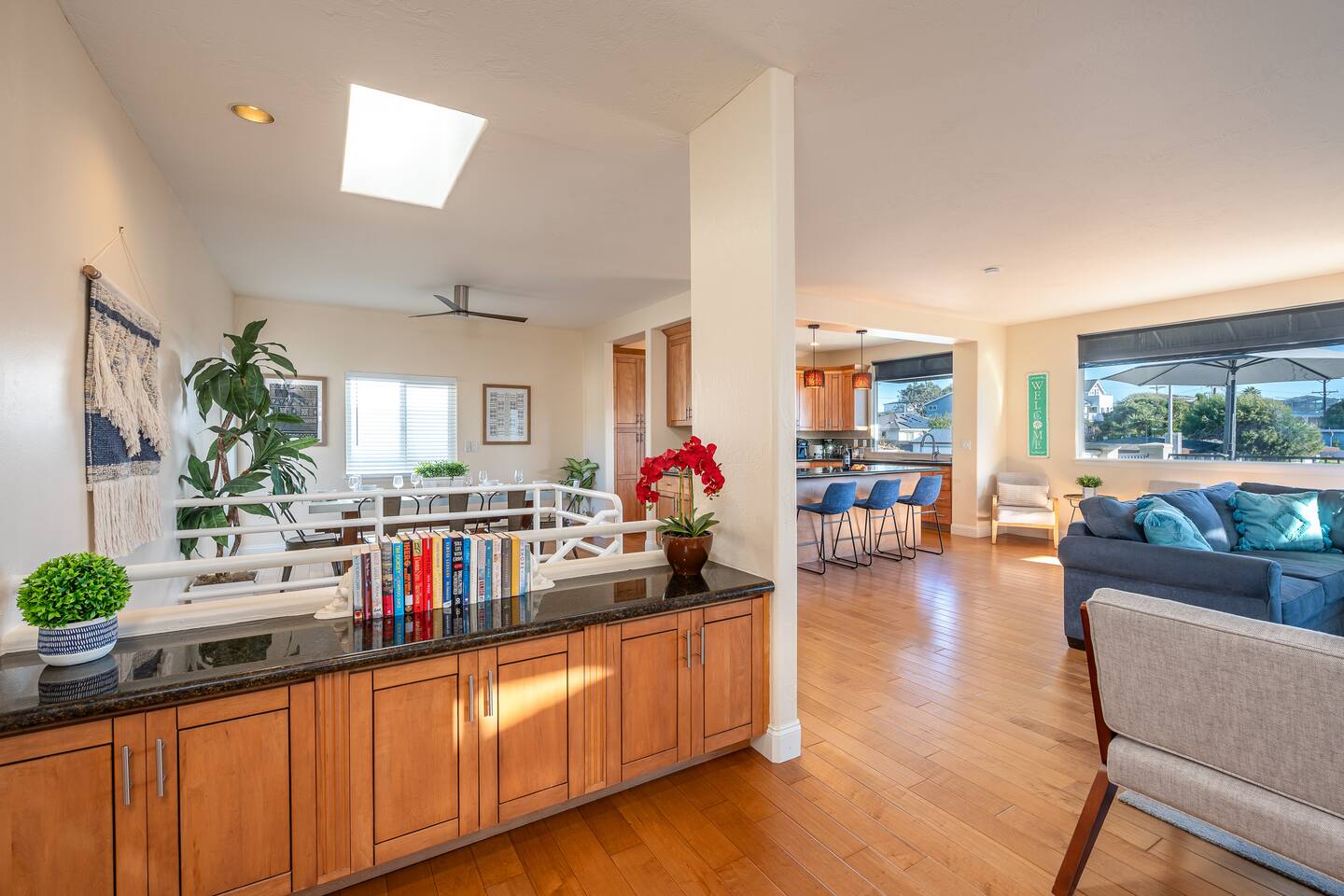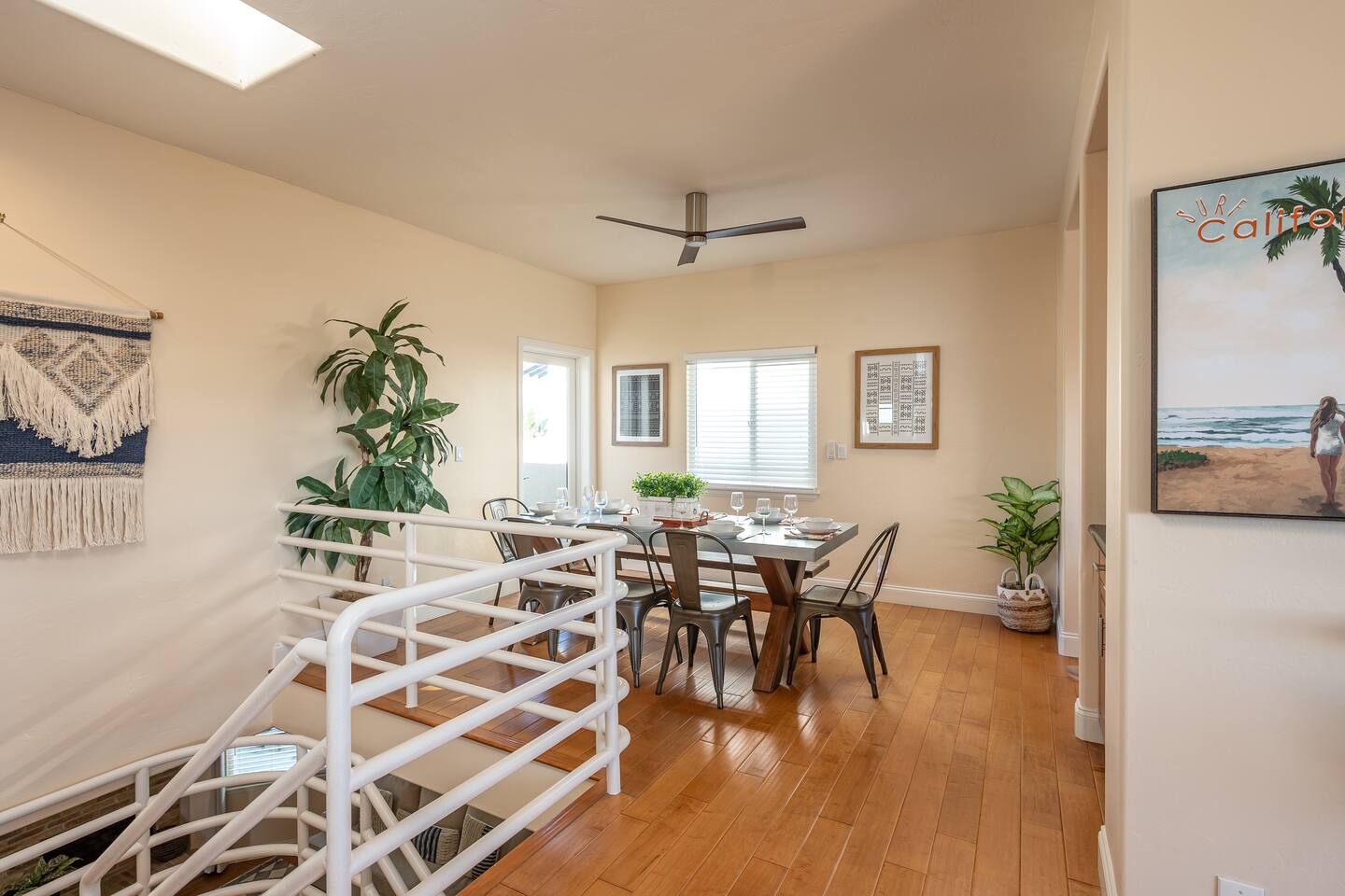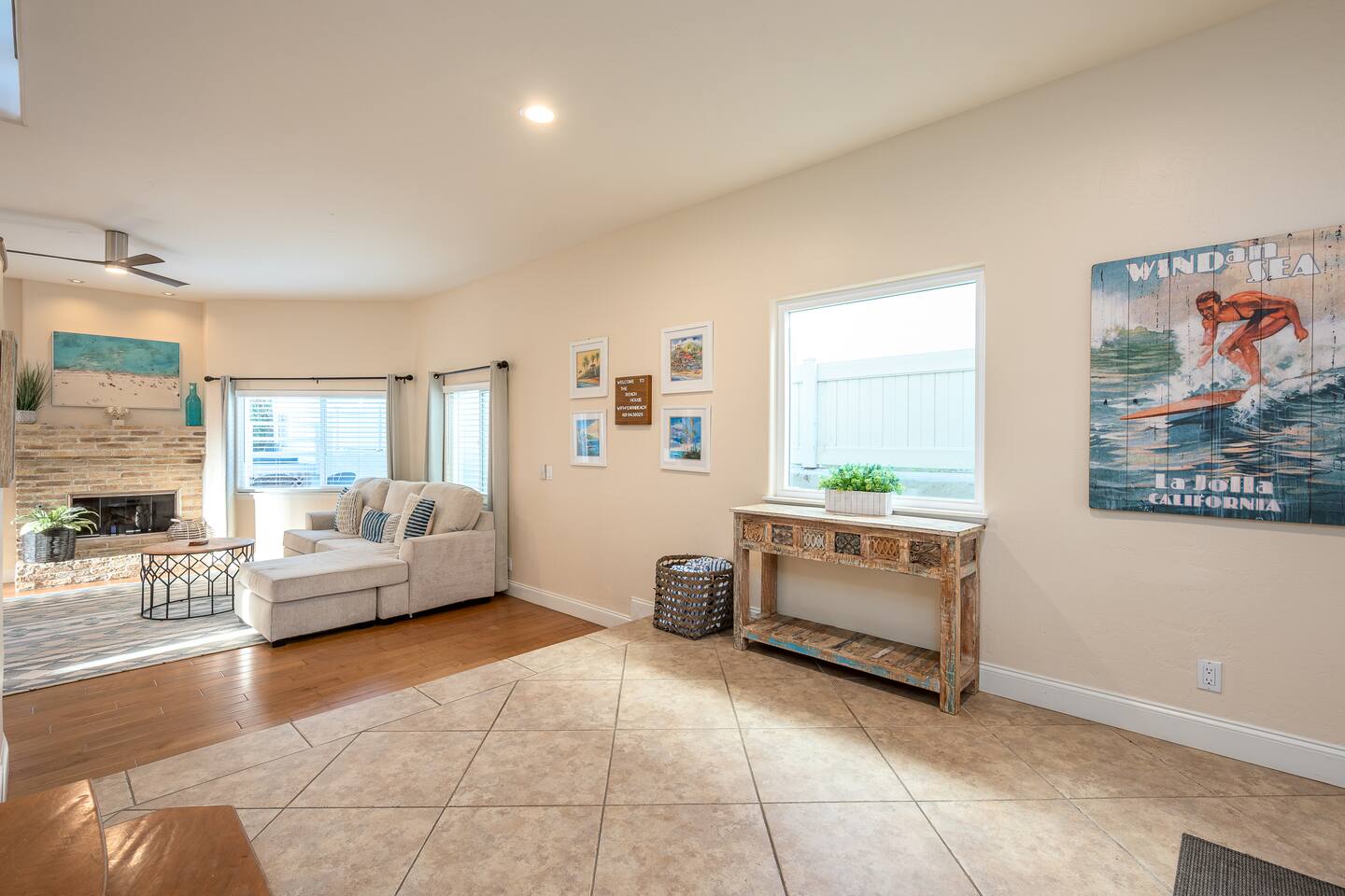 KEY FEATURES: ☀️ Prime Location – Just steps from the beach, perfect for enjoying sun, surf, and ocean breezes ☀️ Sleeps 8 | 4 Bedrooms: Master Bedroom with king bed, ensuite spa-style bathroom; Bedroom 2 king bed with private patio; Bedroom 3 queen bed; Bedroom 4 two twin beds ☀️ 3 Full Bathrooms – Master ensuite: double sinks, jacuzzi spa tub, walk-in shower; hallway full bathroom: tub/shower combo; main-floor full bathroom: tub/shower combo ☀️ Fully Equipped Kitchen – Full kitchen with bar seating for 3, coffee maker (coffee, creamer, sugar provided), blender, air fryer, toaster, stove, microwave, refrigerator, oven, dishwasher, and all cooking essentials ☀️ Dining Areas – Second-floor dining table seats 8 ☀️ Multiple Living Spaces – Second-floor living room with L-shaped sofa, fireplace, and Smart TV with soundbar; First-floor living room with large sofa, fireplace, mini-fridge, flat-screen Smart TV, and board games for added entertainment ☀️ Central A/C & Heating — for year-round comfort ☀️ Washer & Dryer — In-unit laundry for your convenience ☀️ Family Friendly – Beach towels, toys, wagon, boogie boards, chairs, and drying rack provided ☀️ Backyard Patio – Features a jacuzzi tub, chairs for relaxing and unwinding ☀️ Upstairs Deck– Equipped with a grill, large L-shaped sofa, dining table for 6, and umbrella for shaded outdoor dining ☀️ Parking – 4 driveway spaces + additional street parking ✨ BEDROOMS ✨ This two-level home comfortably sleeps up to 8 guests in 4 thoughtfully designed bedrooms: Master Bedroom (Upstairs) features a king-size bed, dresser, large closet, standing fan, and an ensuite bathroom with double sinks, a jacuzzi spa tub, and a walk-in shower, Bedroom 2 features a king-size bed, a small patio, a cabinet, and a desk with a chair ideal for remote work or leisure, Bedroom 3 (First Floor) features a queen bed and a closet, Bedroom 4 features two twin beds and a closet ✨ BATHROOMS ✨ There are three full bathrooms throughout the home. The ensuite bathroom features a jacuzzi tub and standing shower, Bathroom 2 includes a shower/tub combo, and Bathroom 3 on the first floor also has a shower/tub combo, easily accessible from the living areas. Fresh towels and complimentary toiletries are provided for your convenience. ✨ KITCHEN & LIVING AREA ✨ Enjoy a fully equipped kitchen with bar seating for 3, stocked with all your cooking essentials, including a coffee maker (with coffee, creamer, and sugar provided), blender, toaster, dishwasher, and more. You’ll enjoy two separate living areas: The Living Room (First Floor) features a large sofa, fireplace, mini fridge, a flat-screen Smart TV, and a variety of board games for added entertainment, while the Living Room (Second Floor) features a large L-shaped sofa, Smart TV with soundbar, fireplace, and standing fan. ✨ OUTSIDE SPACE ✨ Wake up to breathtaking sunrises and enjoy your morning coffee from the Upstairs Deck, which features a grill, large L-shaped sofa, dining table for 6, and an umbrella for shaded outdoor dining, or relax in the Backyard Patio, which includes a jacuzzi tub, chairs for unwinding and hanging out.
