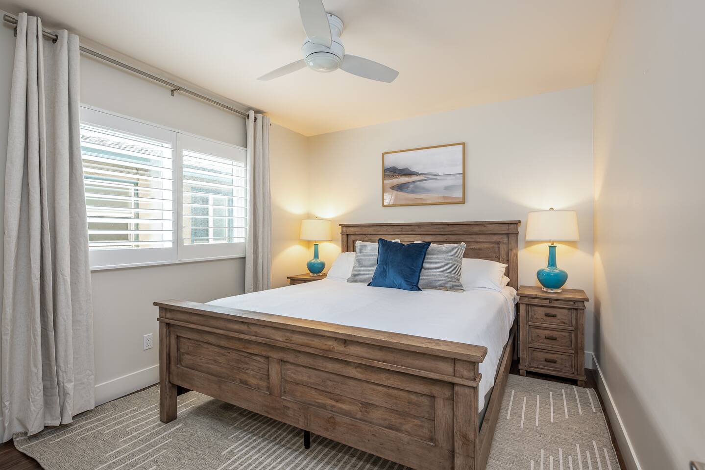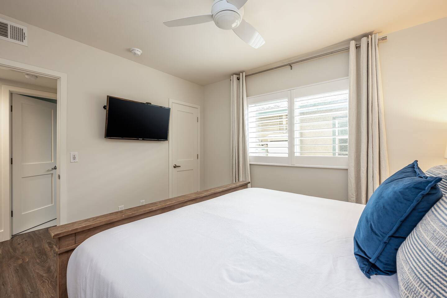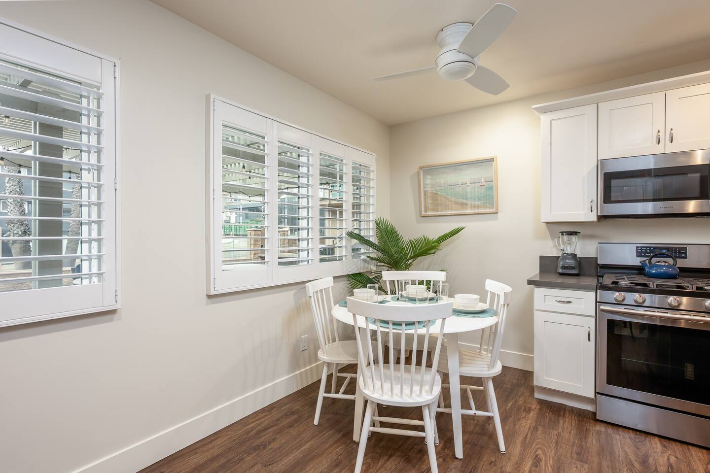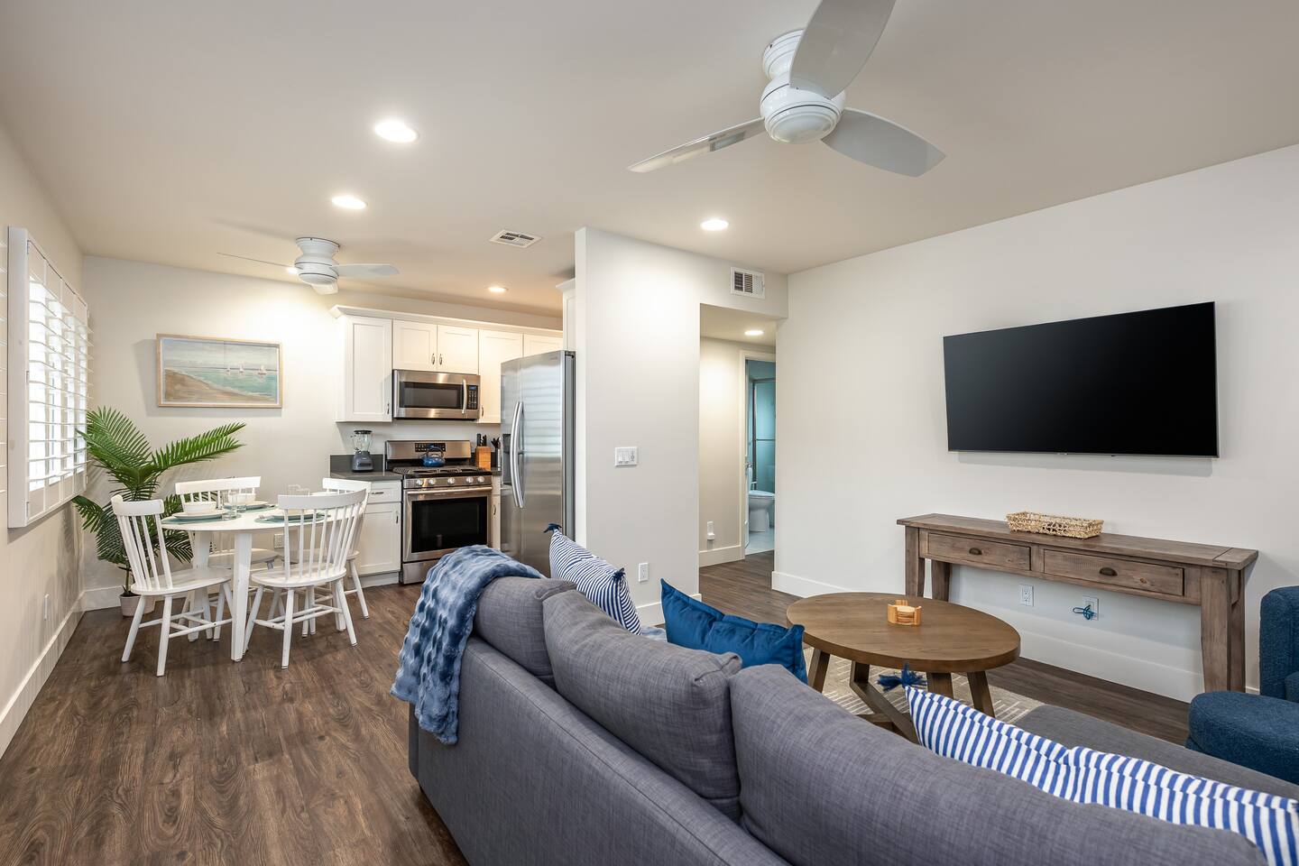 Steps to the Shore Unit 2 is a comfortable bottom floor 1BR with an open layout, step free entry, and everything needed for an easy coastal stay. Ideal for couples, solo travelers, or small groups. KEY FEATURES • 🚪 Bottom Floor Convenience: Step free access • 💤 Sleeps 3: King bed plus queen sleeper sofa • ❄️ Central A/C and Heat • 🍳 Fully Equipped Kitchen • 🍽️ Dining Table Seating for 4 • 📺 Roku TVs in bedroom and living room • 🚿 Full Bathroom: Tub and shower combo • 🚗 Parking: Street parking only • 🏡 Shared Courtyard: Grills, dining, string lights, Adirondack chairs, sunset seating ✨ BEDROOMS • Primary Bedroom: King bed, Roku TV, blackout curtains, shutters • Living Room: Queen sleeper sofa ✨ KITCHEN & LIVING AREA Full kitchen with major appliances and essentials. Dining table seats 4. Living room includes a sleeper sofa, Roku TV, and ceiling fan. ✨ BATHROOM Tub/shower combo, fresh towels, toiletries, and hair dryer.