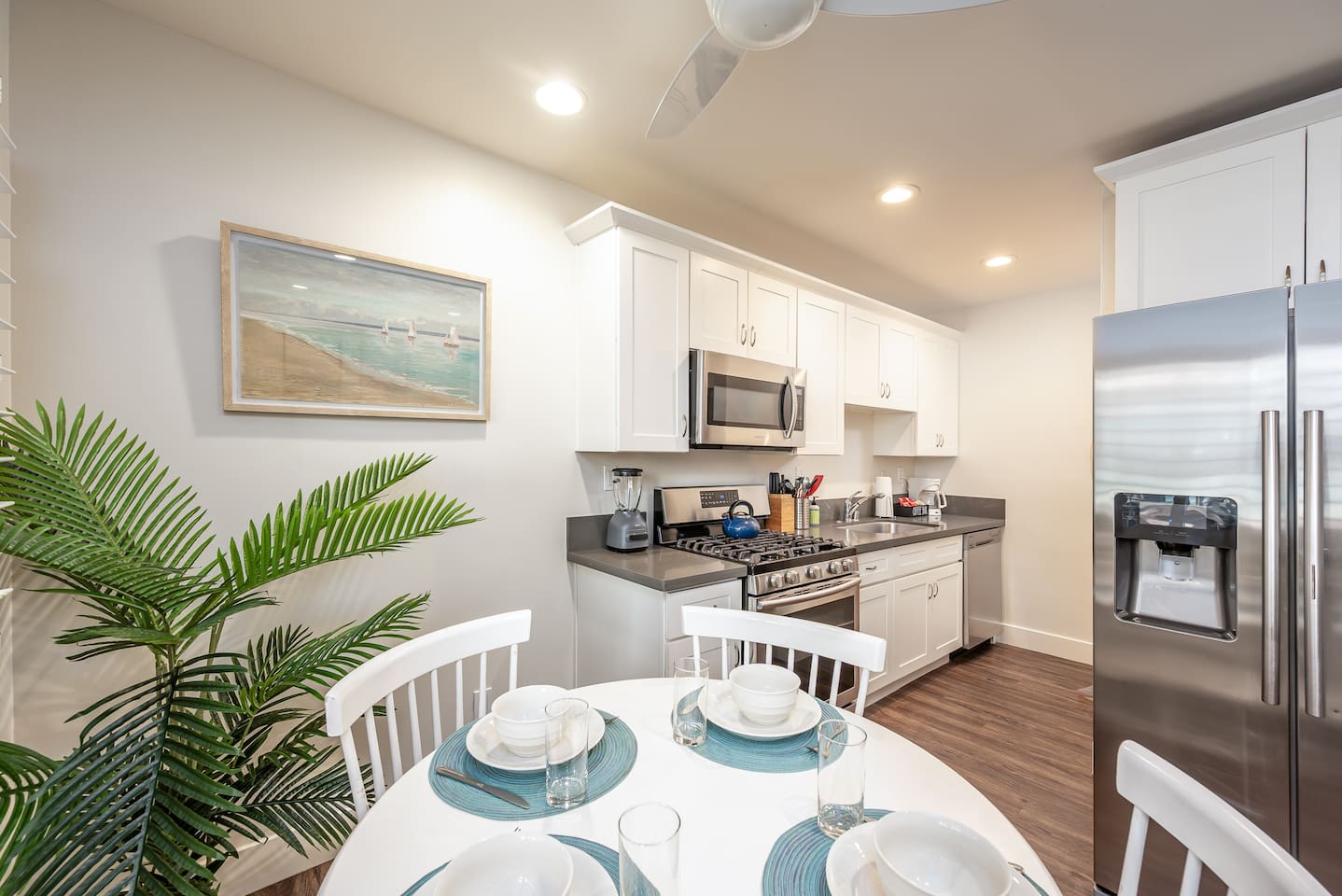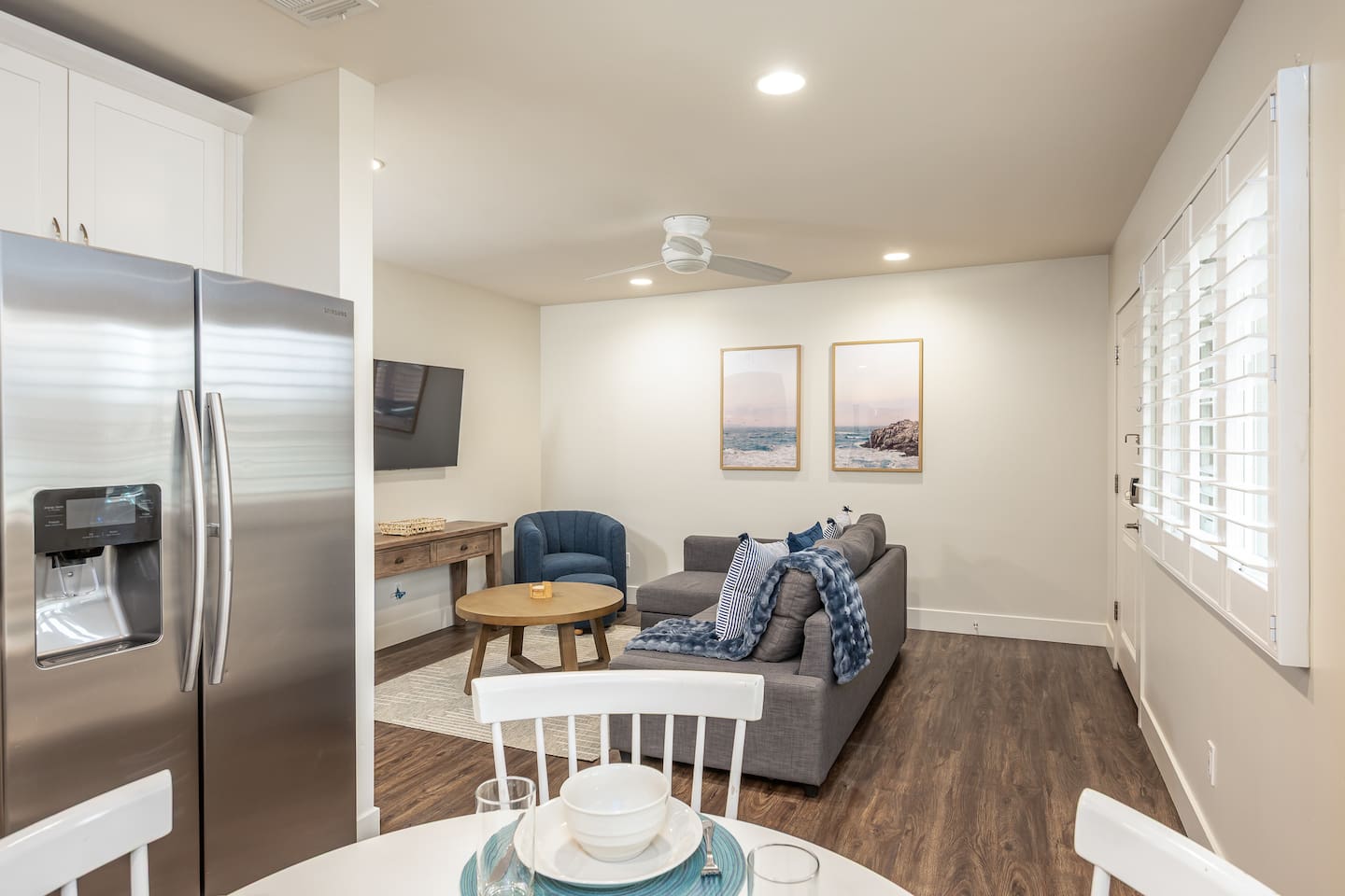 Welcome to Steps to the Shore, a boutique seven unit coastal property just steps from the beach in Oceanside. Unit 2 is a cozy bottom floor 1BR with step free access, a king bedroom, sleeper sofa, and full kitchen. Enjoy an 8 minute walk to Buccaneer Beach, quick drives to nearby restaurants and coffee shops, and easy access to Carlsbad Village and Legoland. This corner lot building sits along two busy streets, so some road noise should be expected. Street parking only.