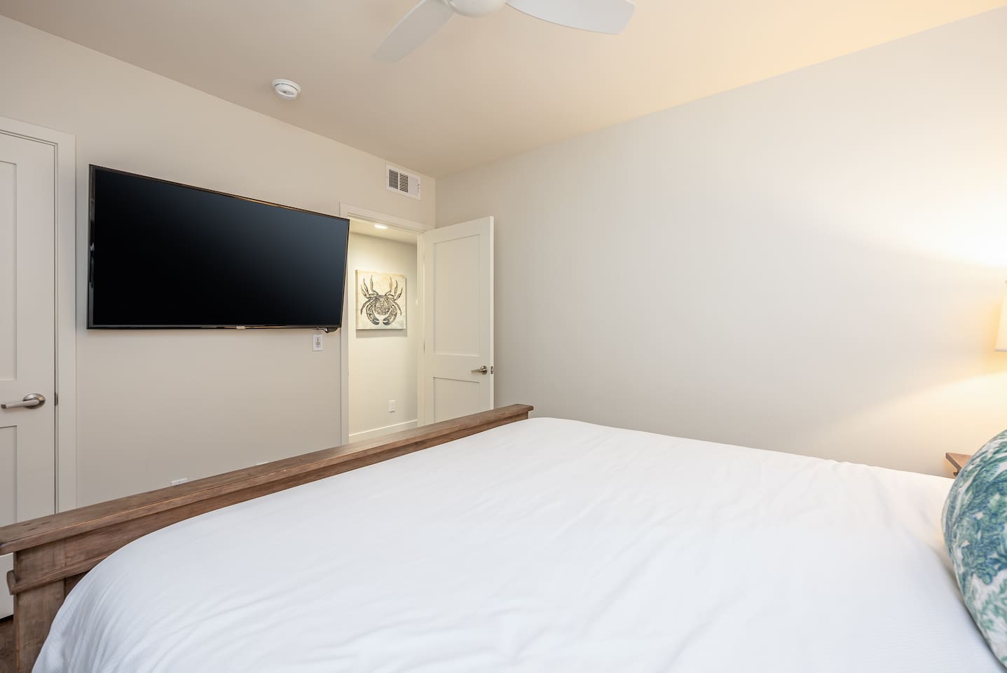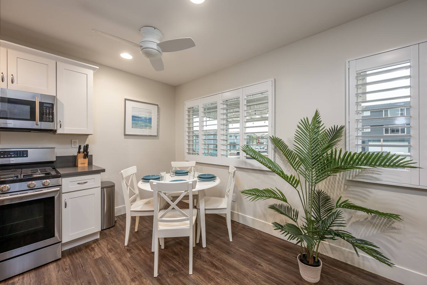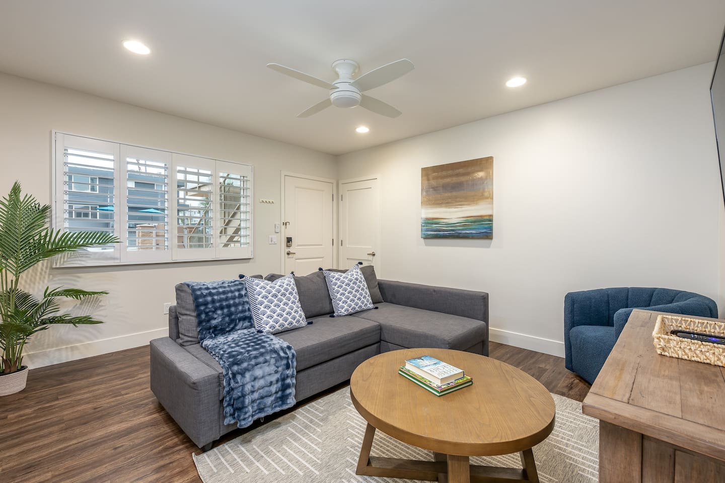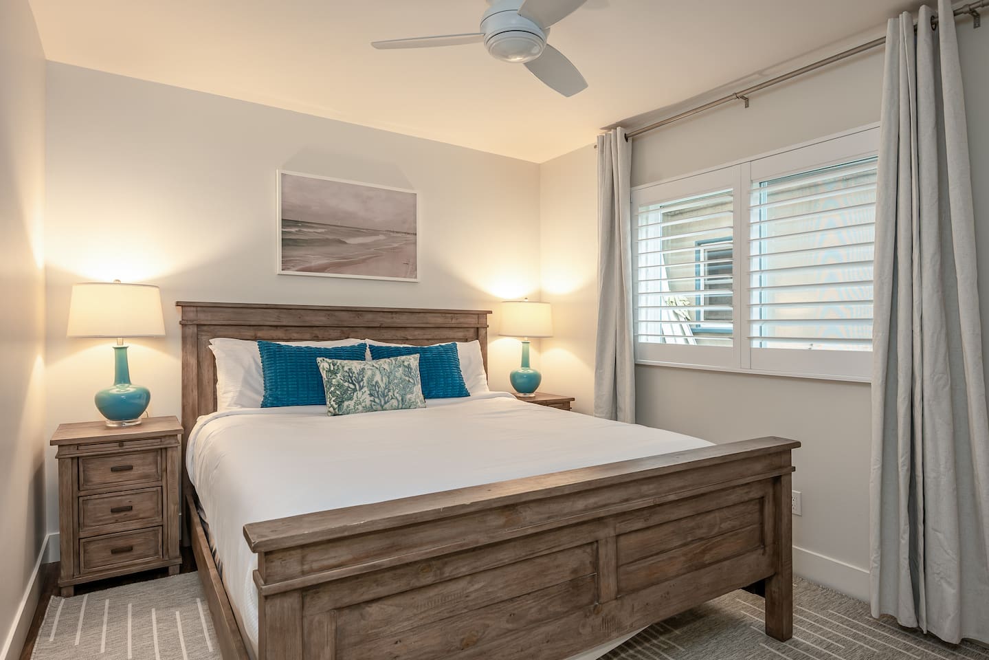 Steps to the Shore Unit 3 is a welcoming bottom floor 1BR with an open layout, easy access, and thoughtful comforts for a relaxed Oceanside stay. KEY FEATURES • 🚪 Bottom Floor Convenience • 💤 Sleeps 3: King bed + queen sleeper sofa • ❄️ Central A/C and Heat • 🍳 Fully Equipped Kitchen • 🍽️ Dining Table Seating for 4 • 📺 Roku TVs in both rooms • 🚿 Full Bathroom: Tub/shower combo • 🚗 Tandem Parking for 2: Compact garage + space in front • 🏡 Shared Courtyard: Grills, dining tables, pergola, Adirondack chairs, sunset seating ✨ BEDROOM / LIVING King bedroom with Roku TV, blackout curtains, shutters. Living room with queen sleeper sofa, Roku TV, ceiling fan. ✨ BATHROOM Tub/shower combo, toiletries, towels, hair dryer.