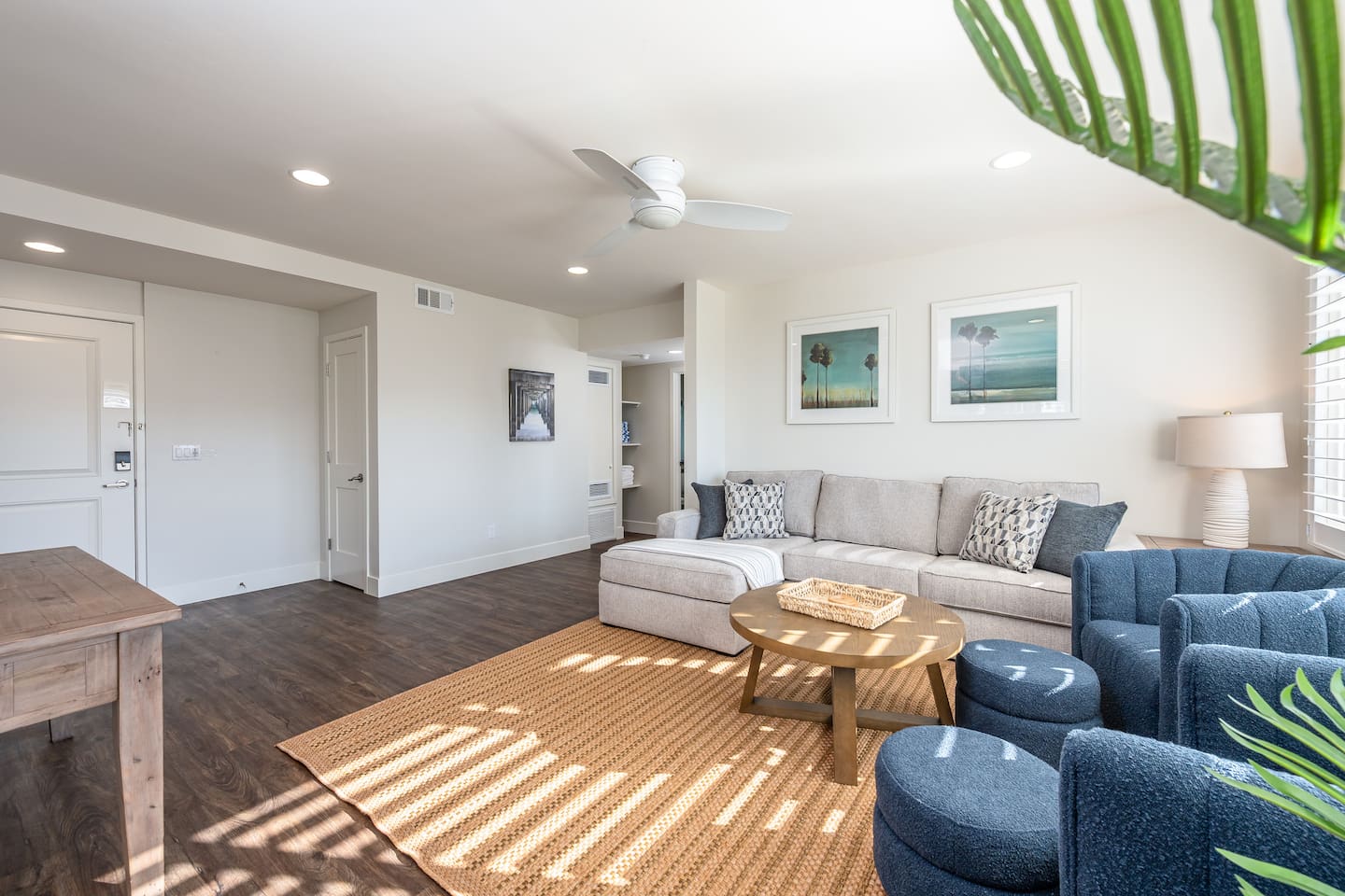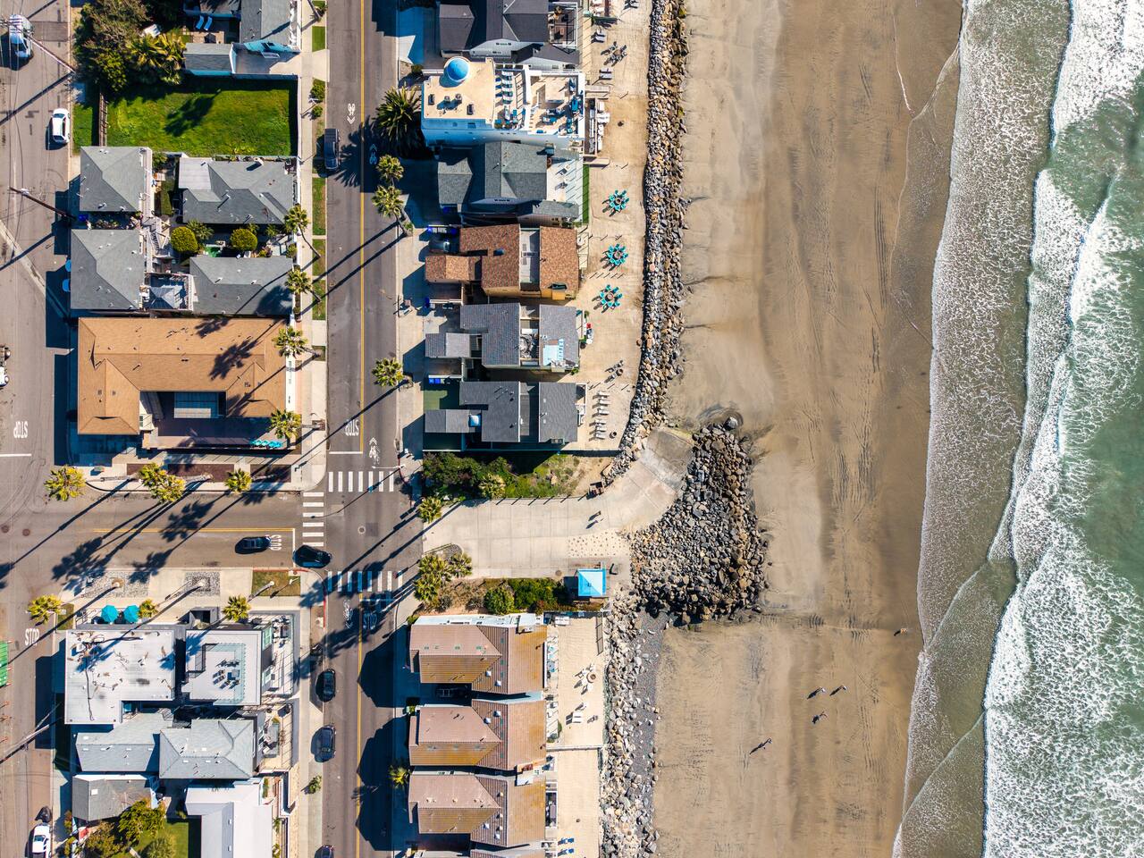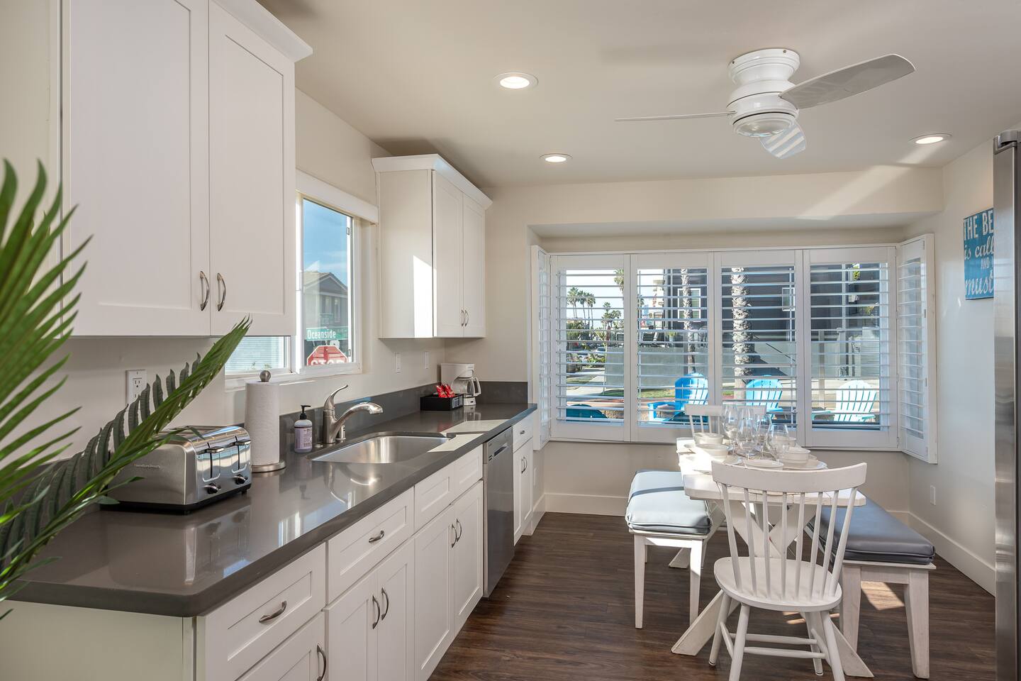 Steps to the Shore Unit 1 is a bright and comfortable bottom floor 2BR retreat with partial ocean views and easy, step free access. Ideal for families and small groups seeking a relaxed beach escape close to everything Oceanside offers. KEY FEATURES • 🌊 Partial Ocean View: Glimpses of the water and refreshing breezes from living room and kitchen • 🚪 Bottom Floor Convenience: No stairs and easy access from the courtyard • 💤 Sleeps 5: Two bedrooms plus a queen sleeper sofa • ❄️ Central A/C and Heat: Year round comfort • 🍳 Fully Equipped Kitchen: Essentials for at home meals • 🍽️ Dining Table Seating for 6 • 🚿 ADA Compliant Bathroom: Walk in shower with chair • 🚗 Tandem Parking for 2 Vehicles: Two tandem outdoor spaces • 🏡 Shared Courtyard: Grills, dining tables, pergola lights, Adirondack chairs, sunset seating ✨ BEDROOMS • Primary Bedroom: King bed, smart TV, ceiling fan, blackout curtains • Bedroom 2: Two twin beds, ceiling fan, blackout curtains • Living Room: Queen sleeper sofa ✨ KITCHEN & LIVING AREA Fully stocked kitchen with refrigerator, stove, microwave, dishwasher, blender, toaster, and drip coffee maker (coffee, creamer, sugar provided). Dining table seats 6. Living room includes a spacious sofa, Roku TV, and partial ocean view windows. ✨ BATHROOM ADA compliant walk in shower with chair, fresh towels, toiletries, and hair dryer.