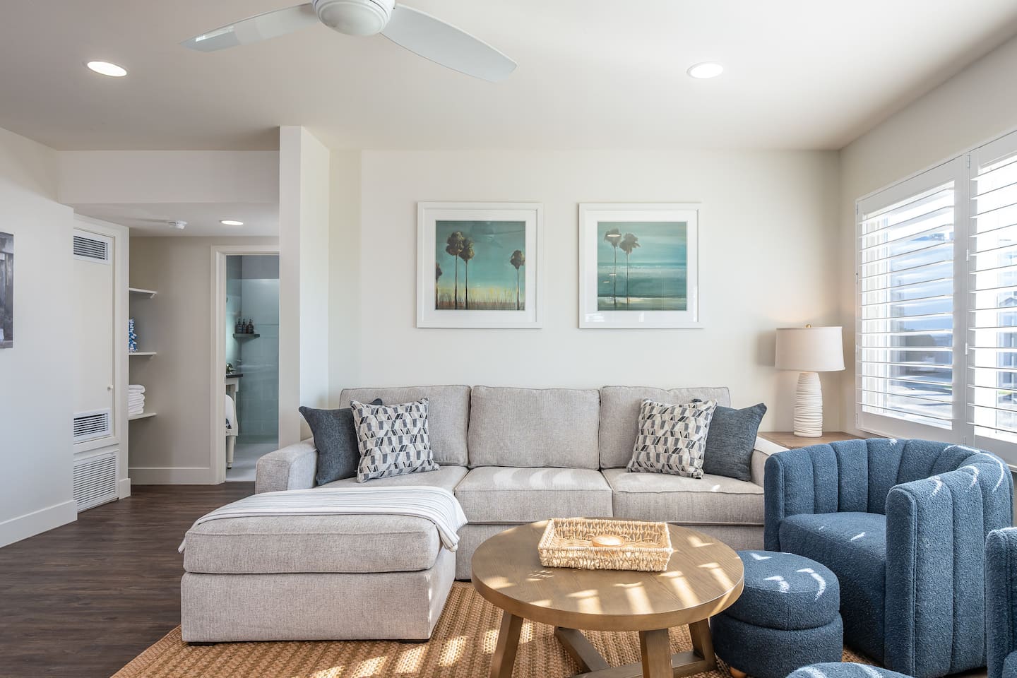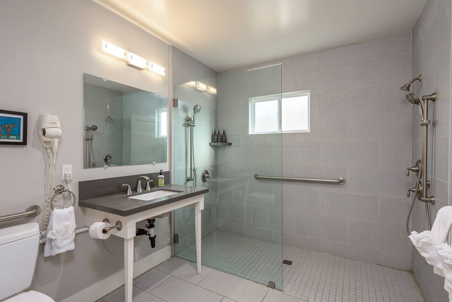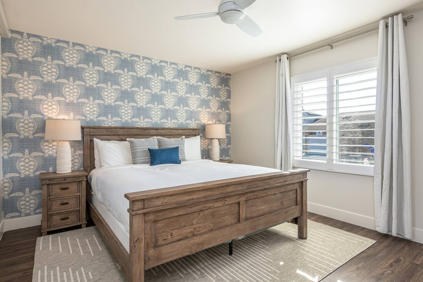 Steps to the Shore Unit 1 is a bright and comfortable bottom floor 2BR retreat with partial ocean views and easy, step free access. Ideal for families and small groups seeking a relaxed beach escape close to everything Oceanside offers. KEY FEATURES • 🌊 Partial Ocean View: Glimpses of the water and refreshing breezes from living room and kitchen • 🚪 Bottom Floor Convenience: No stairs and easy access from the courtyard • 💤 Sleeps 5: Two bedrooms plus a queen sleeper sofa • ❄️ Central A/C and Heat: Year round comfort • 🍳 Fully Equipped Kitchen: Essentials for at home meals • 🍽️ Dining Table Seating for 6 • 🚿 ADA Compliant Bathroom: Walk in shower with chair • 🚗 Tandem Parking for 2 Vehicles: Two tandem outdoor spaces • 🏡 Shared Courtyard: Grills, dining tables, pergola lights, Adirondack chairs, sunset seating ✨ BEDROOMS • Primary Bedroom: King bed, smart TV, ceiling fan, blackout curtains • Bedroom 2: Two twin beds, ceiling fan, blackout curtains • Living Room: Queen sleeper sofa ✨ KITCHEN & LIVING AREA Fully stocked kitchen with refrigerator, stove, microwave, dishwasher, blender, toaster, and drip coffee maker (coffee, creamer, sugar provided). Dining table seats 6. Living room includes a spacious sofa, Roku TV, and partial ocean view windows. ✨ BATHROOM ADA compliant walk in shower with chair, fresh towels, toiletries, and hair dryer.