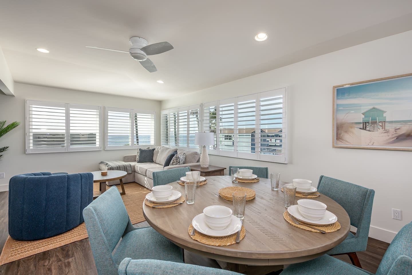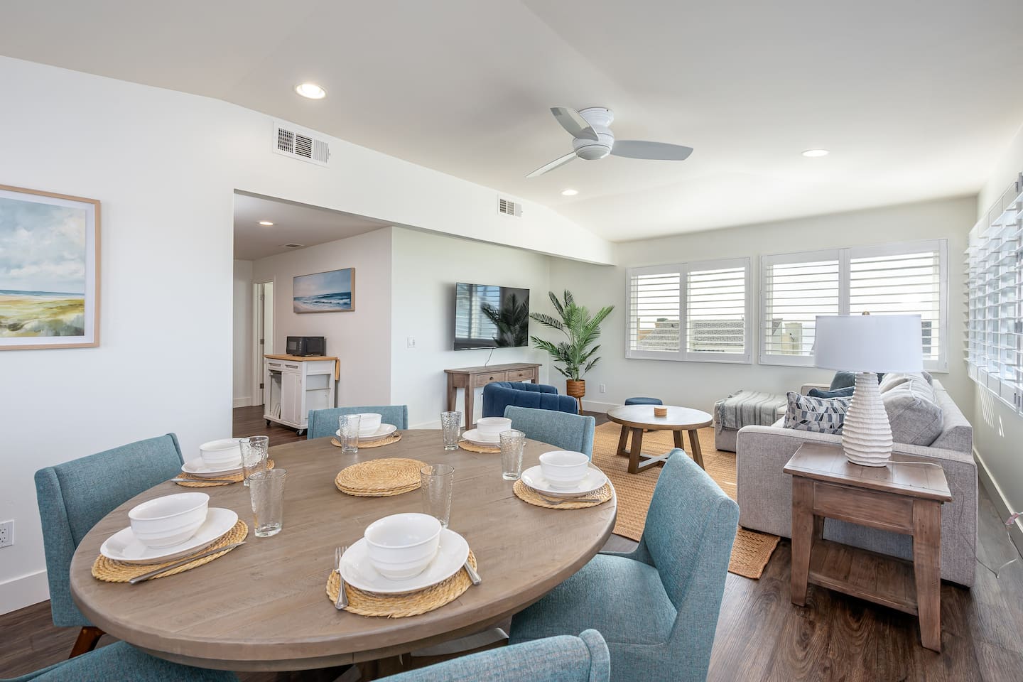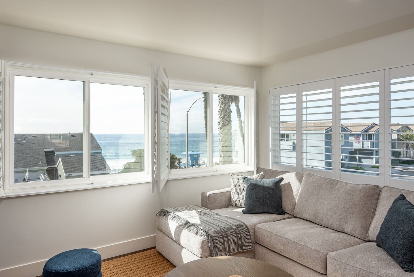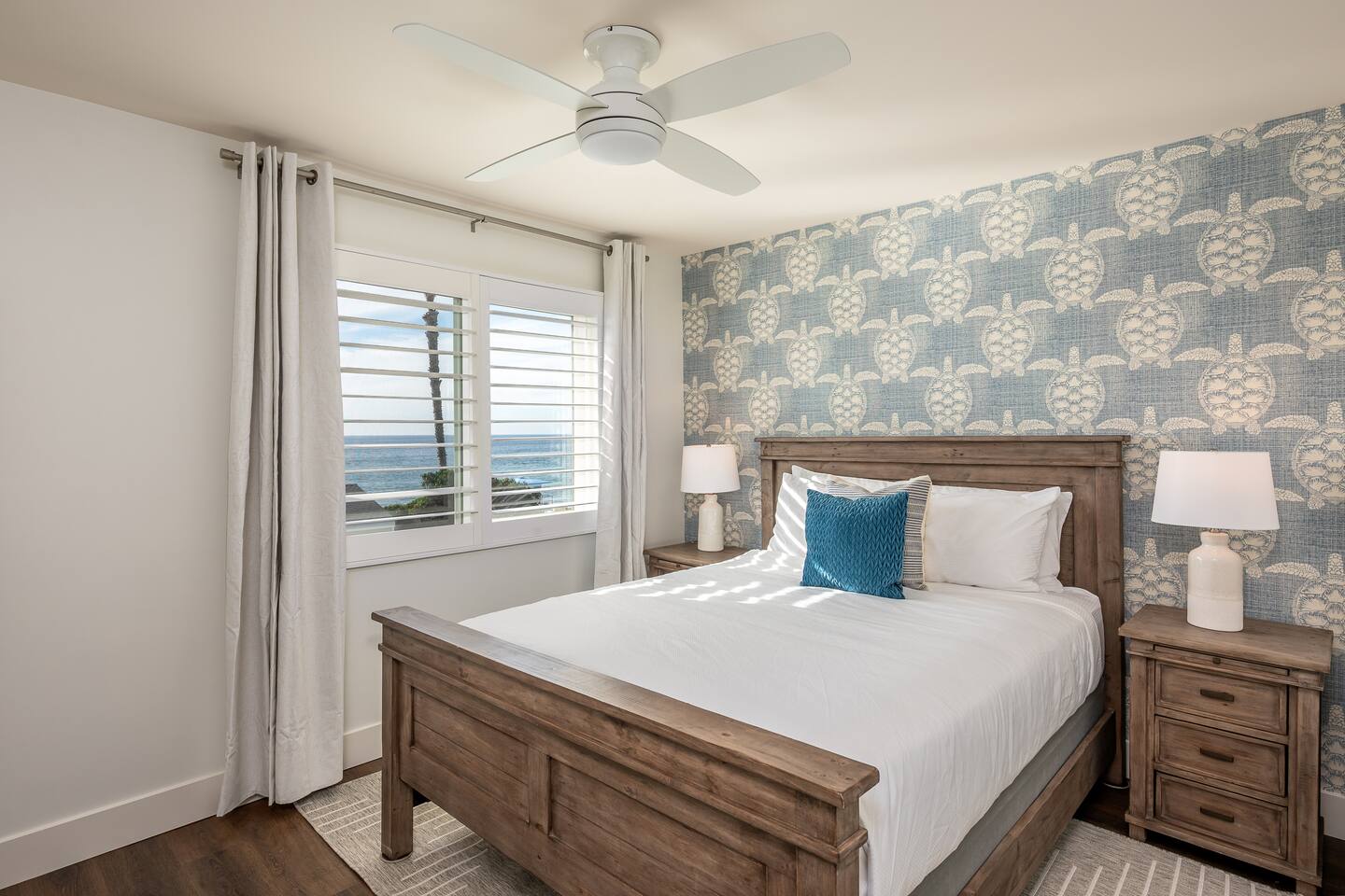 Steps to the Shore Unit 7 is the premier 2BR in the building, offering bright interiors, partial ocean views from three rooms, and the best sightlines on the property. A nearby beach access point enhances the view, and sunsets can be enjoyed from both inside the unit and the shared courtyard. KEY FEATURES • 🌊 Partial Ocean Views: Living room + both bedrooms • 🌅 Sunset Visibility: From inside the unit and the courtyard • 💤 Sleeps 5: King bedroom, queen bedroom, queen sleeper sofa • 🎨 Stylish Design: Sea turtle feature wallpaper • ❄️ Central A/C and Heat • 🍳 Full Kitchen • 🍽️ Dining Table Seating for 6 • 📺 Smart TV: In second bedroom • 🚗 Tandem Parking: Compact garage + space in front • 🏡 Shared Courtyard: Grills, dining tables, pergola lights, Adirondack chairs ✨ BEDROOMS • Primary Bedroom: King bed, partial ocean view, shutters, blackout curtains • Bedroom 2: Queen bed, partial ocean view, Roku TV, ceiling fan • Living Room: Queen sleeper sofa ✨ KITCHEN & LIVING AREA Full kitchen with appliances and essentials. Dining table seats 6. Living room features partial ocean views and bright natural light. ✨ BATHROOM Tub/shower combo, toiletries, towels, hair dryer.