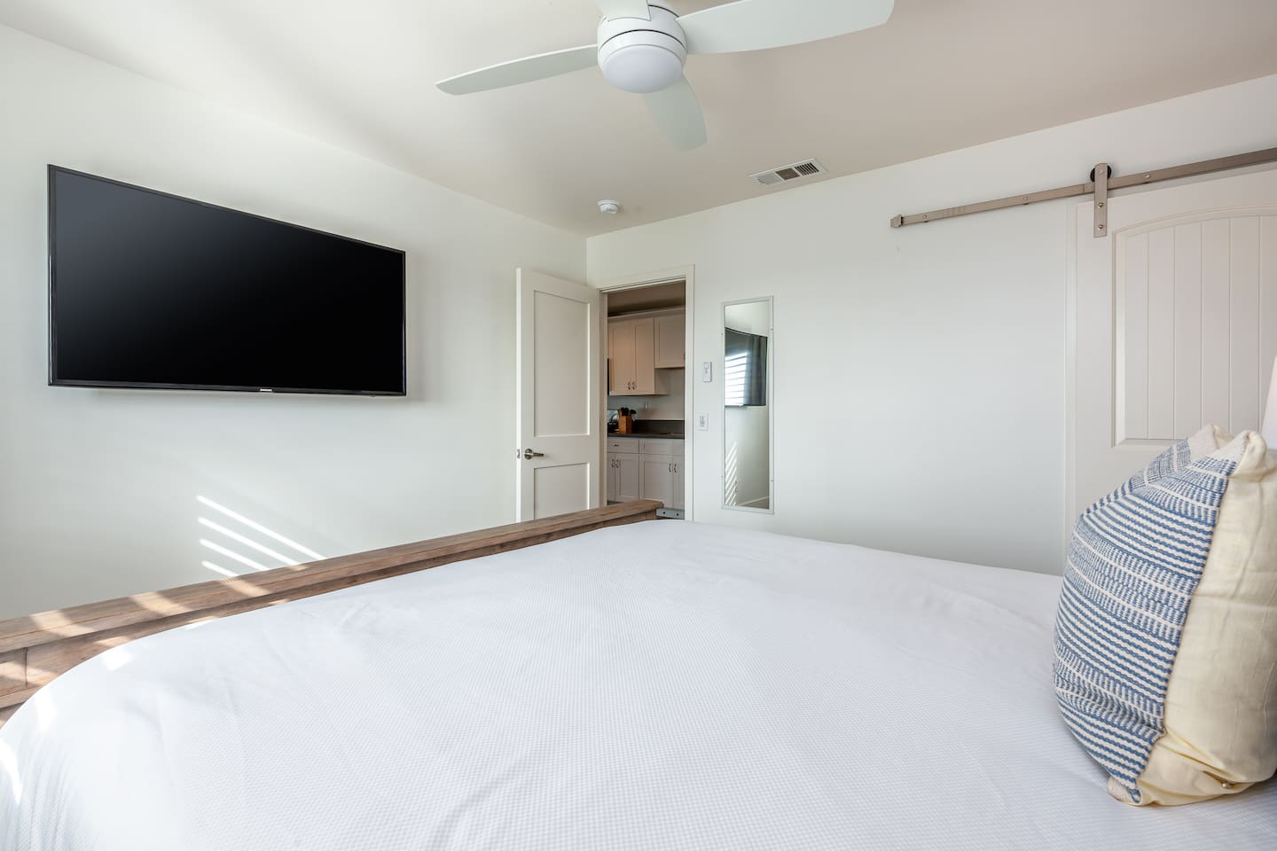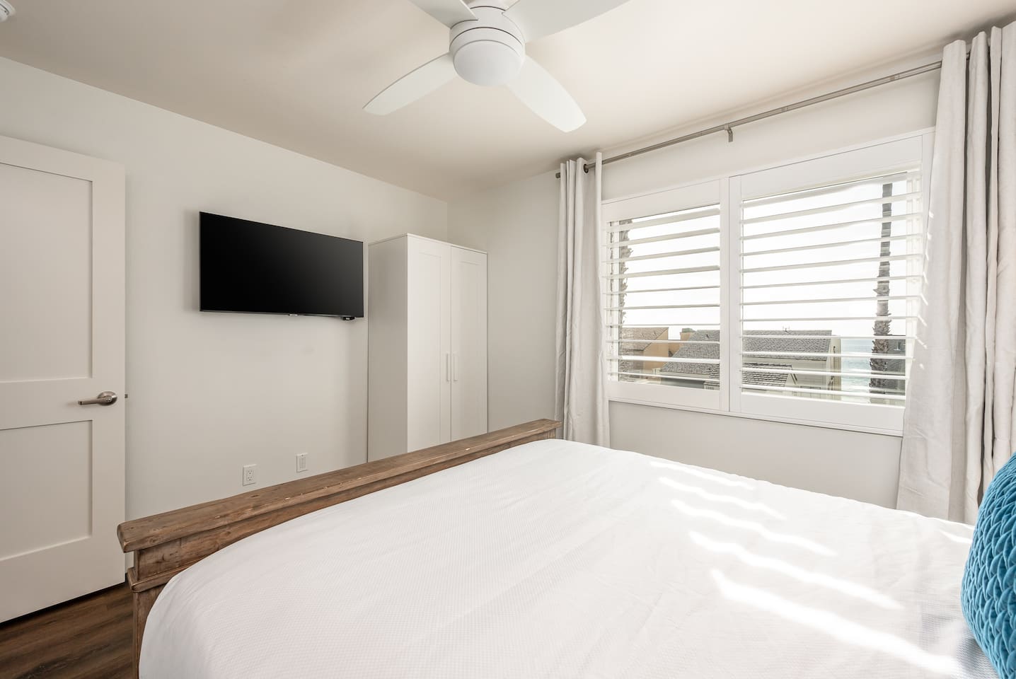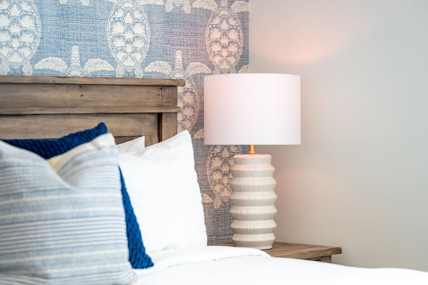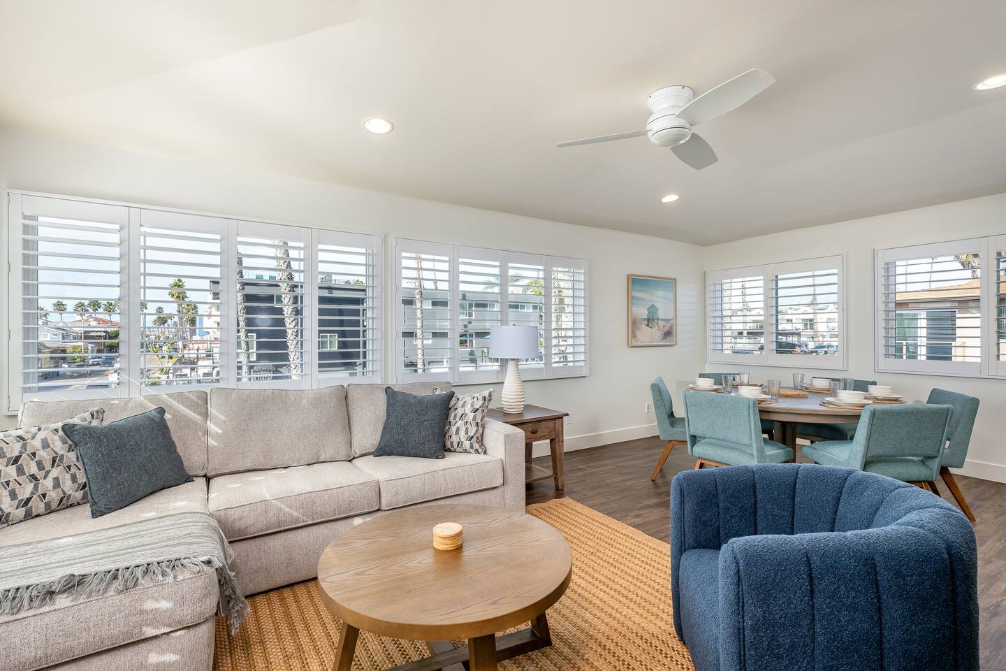 Steps to the Shore Unit 7 is the premier 2BR in the building, offering bright interiors, partial ocean views from three rooms, and the best sightlines on the property. A nearby beach access point enhances the view, and sunsets can be enjoyed from both inside the unit and the shared courtyard. KEY FEATURES • 🌊 Partial Ocean Views: Living room + both bedrooms • 🌅 Sunset Visibility: From inside the unit and the courtyard • 💤 Sleeps 5: King bedroom, queen bedroom, queen sleeper sofa • 🎨 Stylish Design: Sea turtle feature wallpaper • ❄️ Central A/C and Heat • 🍳 Full Kitchen • 🍽️ Dining Table Seating for 6 • 📺 Smart TV: In second bedroom • 🚗 Tandem Parking: Compact garage + space in front • 🏡 Shared Courtyard: Grills, dining tables, pergola lights, Adirondack chairs ✨ BEDROOMS • Primary Bedroom: King bed, partial ocean view, shutters, blackout curtains • Bedroom 2: Queen bed, partial ocean view, Roku TV, ceiling fan • Living Room: Queen sleeper sofa ✨ KITCHEN & LIVING AREA Full kitchen with appliances and essentials. Dining table seats 6. Living room features partial ocean views and bright natural light. ✨ BATHROOM Tub/shower combo, toiletries, towels, hair dryer.